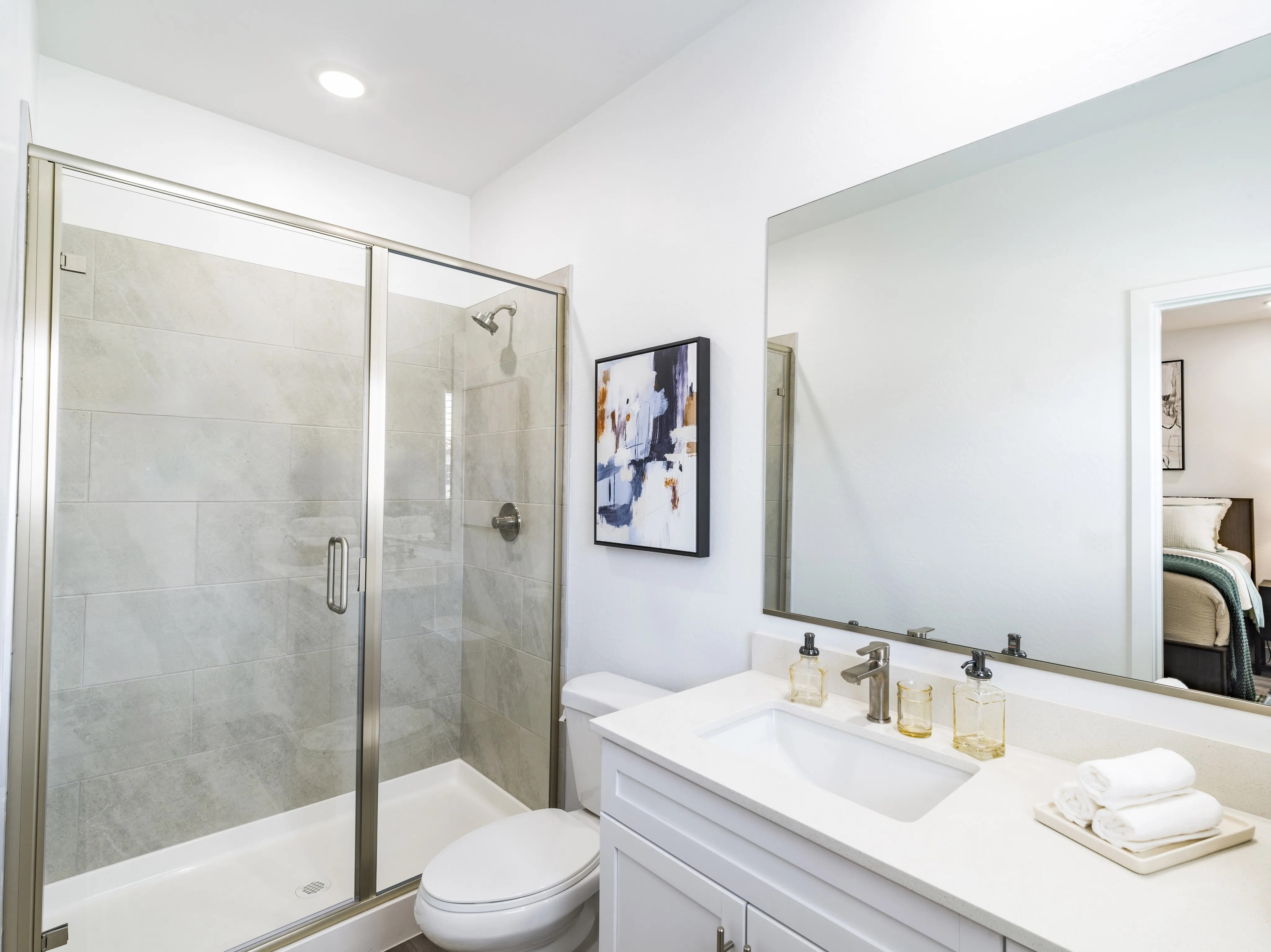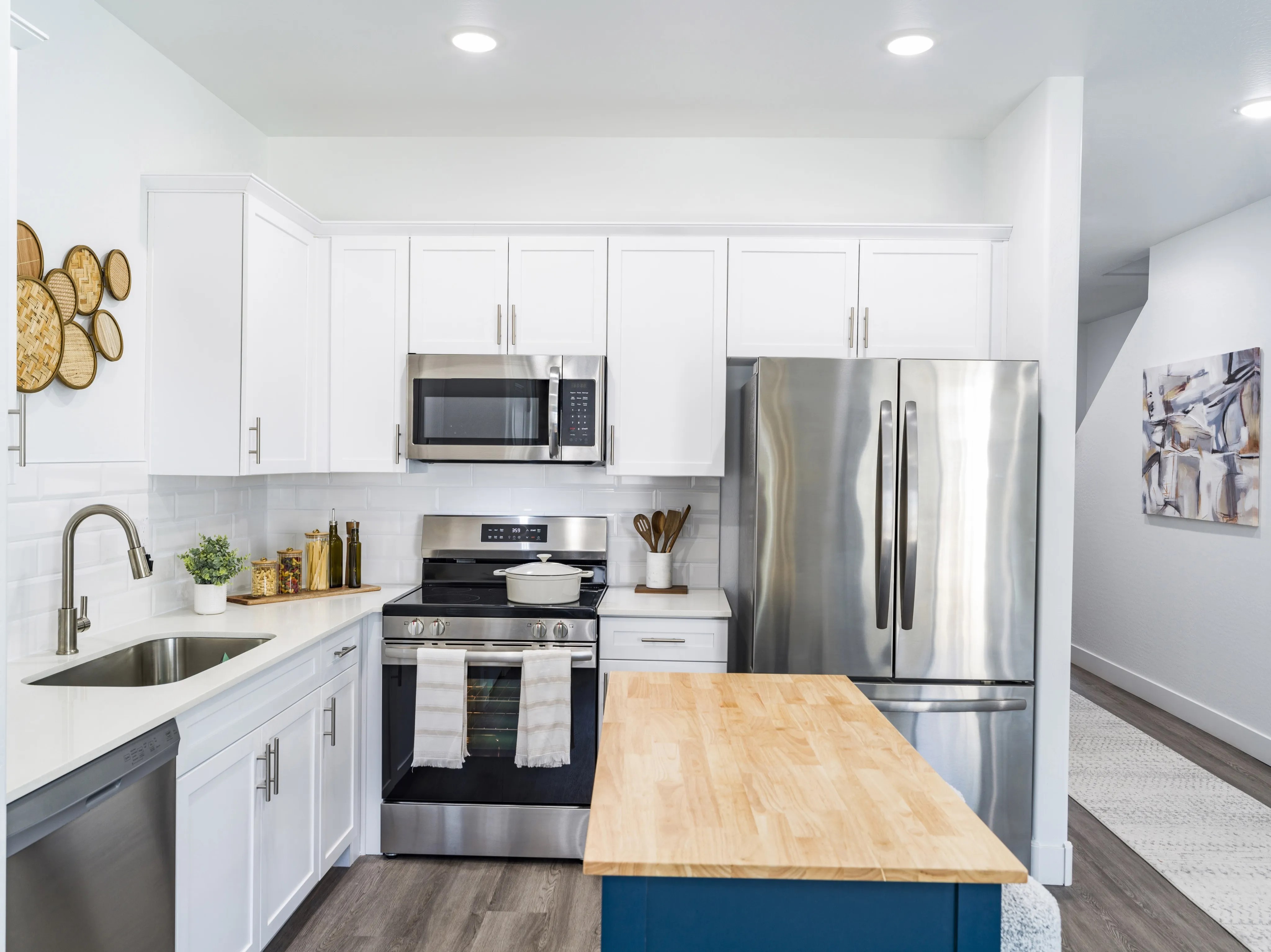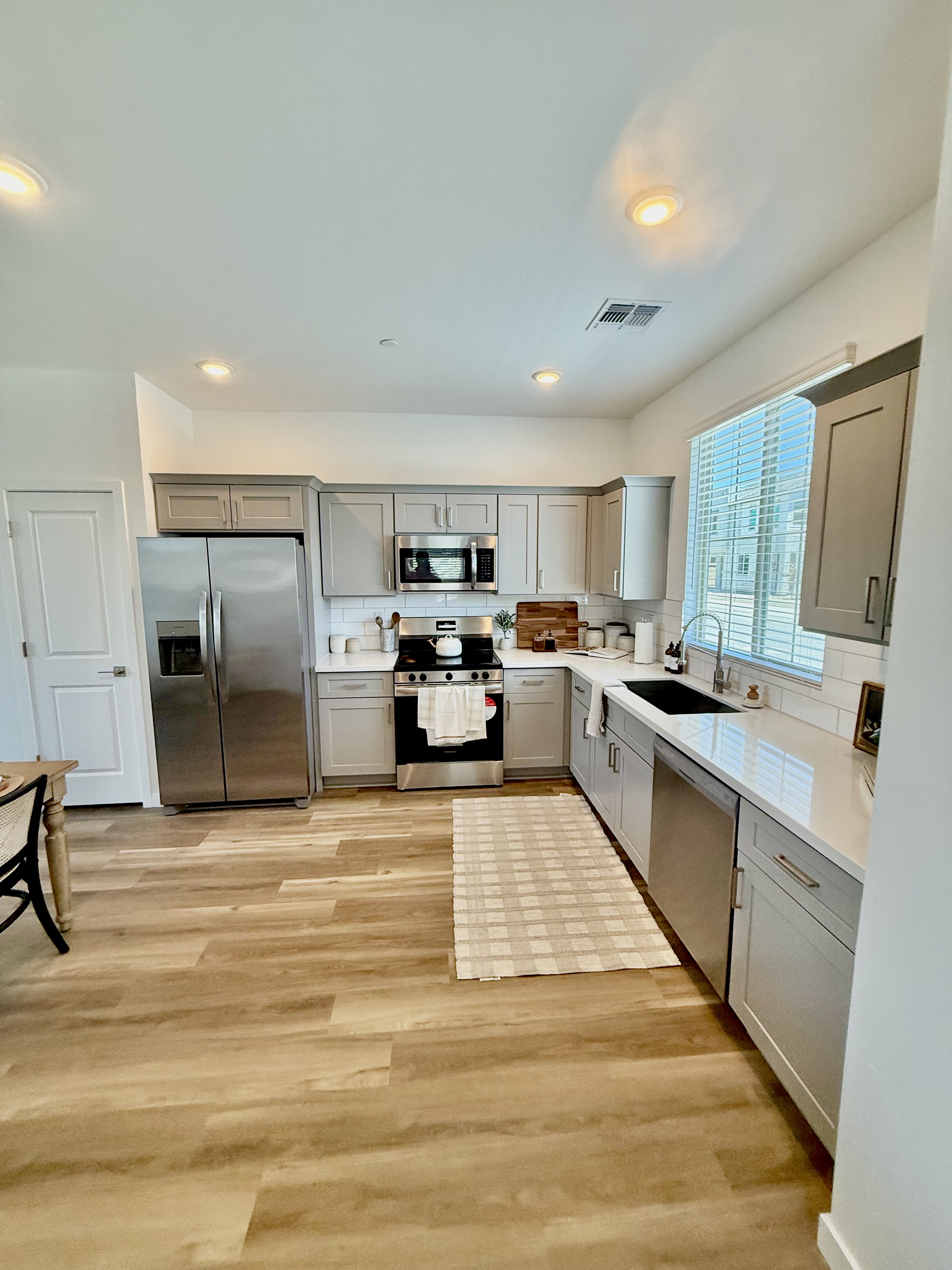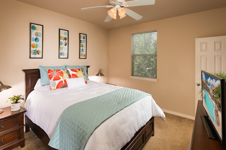 French doors leading to private patio Featured amenity Stainless steel appliances including built-in microwave, refrigerator, and dishwasher Featured amenity In-home washer and dryer Featured amenity Oversized walk-in closets Featured amenity Air conditioning with programmable thermostat Polished quartz countertops Subway tile kitchen backsplash 9-foot ceilings Deep soaker style bathtubs 2-inch faux wood blinds Ceiling fans in living areas and bedrooms -